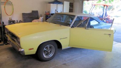1970 Plymouth Sport Satellite, yellow with white vinyl roof, white/black interior, 318 V8, 904 auto, bucket seats/console, A/C, PS. Was daughters driver for several years, currently not running. Resto begun, but unable to continue. 99% all there including nice console, dash/gauges, nice dashpad, mint front bumper with new turn signal bezels and new bumper pads, correct honeycomb (GTX) grille, all trim including unique Sport Satellite qtr panel-grille-upper door bezels, and good glass all around. Usual rust, lower rear quarter panels and lower rear window area. Trunk floor has been replaced. Solid, straight frame rails. Original bucket/rear seats need restored. Aftermarket radio. Road wheels with decent rubber. Extra parts include new distributor, new fuel pump, new engine harness, and used but mint complete dash harness. Excellent project candidate. $6000 OBO. SOCAL area.