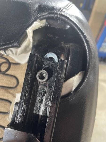 Next is that the out board track (the one with the handle on it) was being bent or flexed when the bolts holding to the seat frame were tightened. This caused the track from not wanting to slide as well as making contact where it shouldn't.
