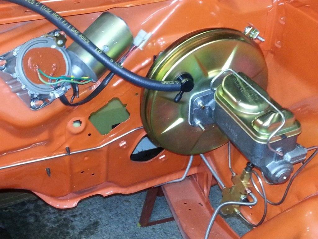 Getting some of the engine compartment components installed before anything else. Front brakes converted to discs, stainless lines, rebuilt the original wiper motor. Everything bolted up, as far as the brakes, just like the power drums did from the factory. Also, the red colored nut holding the proportioning valve to the inner fender.
