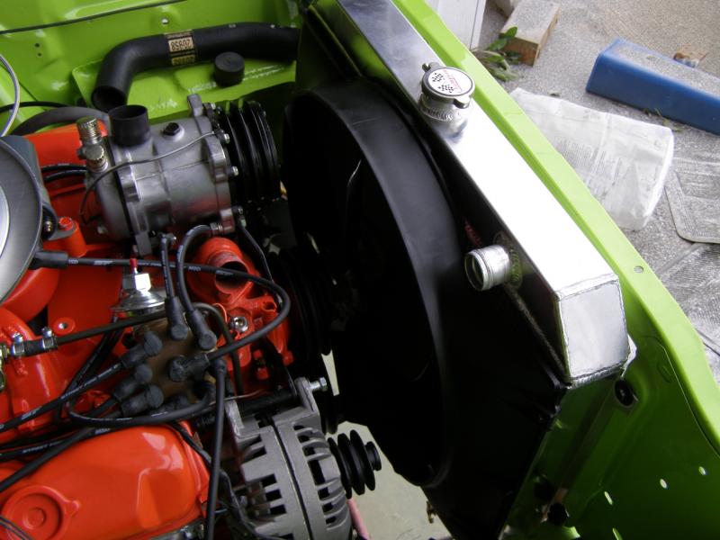 One step closer to making some noise...the radiator showed up today. We got a Champion...looks good. Fit good and the stock shroud fit with no issues. A couple minor tweaks to the upper mounting holes to center it top to bottom to fit the 19 inch 7 blade fan we picked up. Plan is to have it fired up this weekend....or sooner.