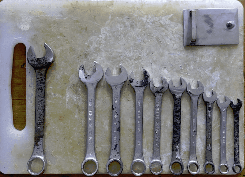 It's amazing what shows up when you are taking a car down to "bare bones". I would be interested to know which "previous owner" lost those wrenches and didn't try to retrieve them. When I took my '69 Bee apart to do the sheet metal repairs (Everett, Wash.) after pulling up the carpet pad, I found 3 safety pins, 2 filter cig. butts, a broken "Hemi" fender call-out and 2 trim moulding clips from another Dodge vehicle. This tells me that there was some "horseplay" going on on the line at Lynch Road. Only the Shadow knows...