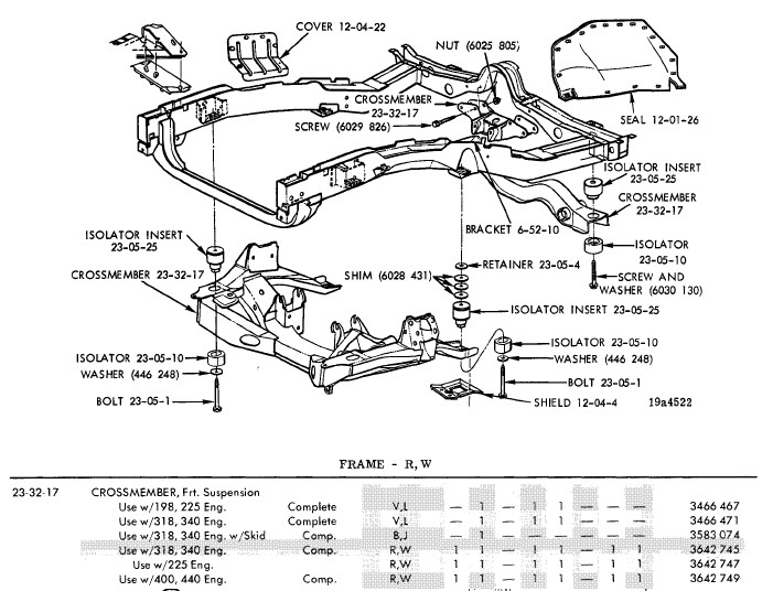 All I know is that I just bolted the 440 in. The oil pan was different from the 72 and older cars. That was it. It has been years since I did it. I think I used 400 motor mounts on a 1970 440 and bolted it in where the 318 was. Now I am curious also. I just asked a friend who put a big block in his 73 Charger. He said he used the 318 K frame. So why 3 k-frames?