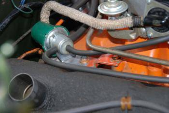 CORRECT....the purpose is to INCREASE the distributor vacuum to maximum degrees, when DECELERATING, to improve emissions by providing more advance during lean coast down then, after a programmed delay, return to normal. Since the vacuum advance port connection is on the REAR carb, it should be connected there not to the front carb. IMO...the carb linkage is backward but as long as it works, should be OK Pethaps consider a 1971 HEMI choke control system (manual cable operated) in lieu of a hot air choke assrmbly, if not concurs restoration..... just talking out loud....The valve is the Distributor vacuum control valve. And the vacuum lines are on it wrong.