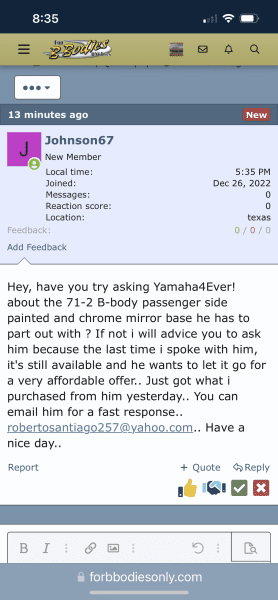 That was the red flag that got my attention. When I asked him why he had zero posts and zero reaction and had been a member since '09 he vanished. The crazy part is it was a $30 item but I guess $30+ $30+$30 eventually ads up.Member since 2009 and zero reaction score plus a zero message count...... equals a bad omen for any exchange.