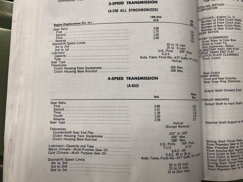 Nice you have learned.I struggled with this question for years with the A833 18 spline transmissions I own. When I first rebuilt mine back in 1980, it had ATF in it. That didn't seem right but agreed with the FSM. I filled it with 80W90 gear oil at the time and it never shifted properly to my satisfaction. Tried 85W140, same issue. Strait SAE 140 was impossible to find at my location so I crossed referenced an ISO equivalent lube oil from work. That work best for years. When I freshened the trans in 2000, I procured needed pieces from Liberty's Gears in Detroit. At that time they indicated that the Mopar (Direct Connection) synchro rings that I had used back in 1980 were not made correctly and was part of the problem I had originally experienced. I used their (Liberty's) supplied synchro rings and they worked great, but I still was using the ISO 140 oil. Moving forward another 20 years, I have just changed all of the fluids in this car. I used the Penzoil GL-4 Synchromesh Fluid (didn't have a source of the ISO 140 anymore) and it seems to be doing the trick so far. GL-5 80W90 went in the Dana.