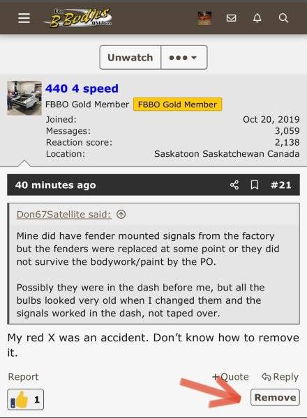 My red X was an accident. Don’t know how to remove it.Mine did have fender mounted signals from the factory but the fenders were replaced at some point or they did not survive the bodywork/paint by the PO.