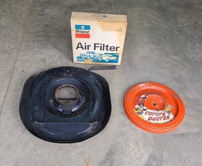 Listing this item for a friend. 1970-72 airgrabber aircleaner. This fits 383 and 400 equipped Plymouths equipped with the optional N96 airgrabber hood. The base and lid are original Chrysler parts and are not dented or bent. They appear to be wearing their original paint and decal. Also available is a NOS air filter element with the cool original box. The parts are located in central Maine.