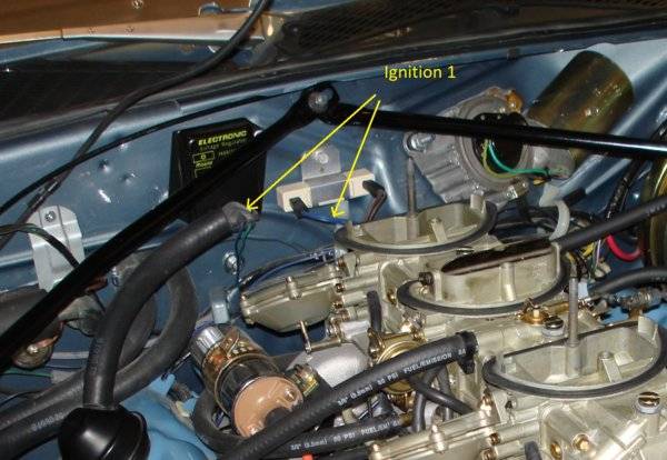 Forget about the coil, bypass, brown wire to the coil. Ignition 1 (ignition switched/run power) is present on the blue wire/wires in the engine harness. You will find these wires at one end of the ballast resistor, at one of the field leads at the alternator, and one lead at the voltage regulator. If the wire colors are not clear, disconnect the field leads, get out a volt meter and check with the key on. You will find only one wire that measures battery voltage there with the key on.
