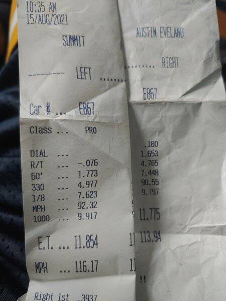Yea 1st and second gear are like driving on ice without the tires being planted. My son took the video on FB, it might be his security settings.Wow, those are marginal for sure. At that trap speed I would expect 1.45 (or close to it) 60' times and 10.90's to 11.0's. Can you PM me a link to your video? It won't come up from your post.