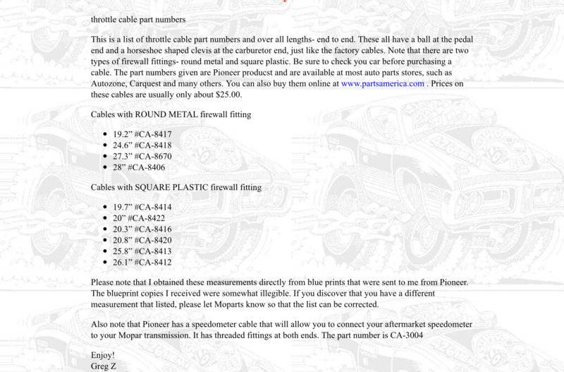 I have a 69 Coronet R/T with a 440-4bbl. My stock original throttle cable frayed and wore out, the one I got from Classic industries is longer but I thought I could make it work. I have a Torker 2 intake with a Holley carb and a 1 inch spacer. The new cable is not going to work, it is too long and only has about 1 inch of pull.Even if I do modify a bracket to hold the housing, the pull will only get a little over half throttle. Anybody have any suppliers for a stock 69 b body throttle cable? The previous cable did work. Thanx, Jack.