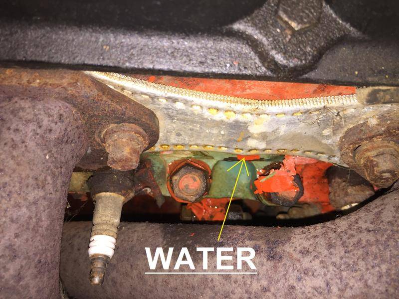 So I noticed that the coolant was low (I wasn't able to see any in the radiator) So I filled it up, All of a sudden water starts pouring out the passenger side of the motor... I couldn't tell where it was coming from so I let it dry and then slowly poured some water in the radiator. Water is coming from behind (not above!) the exhaust manifold gasket, is there a freeze plug or something behind there? The cylinder on the right is at the front of the motor.
