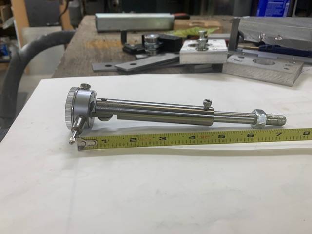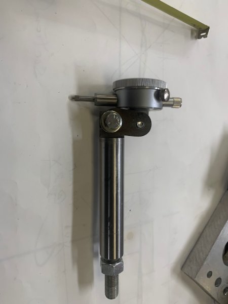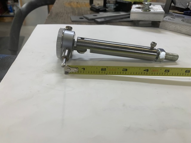 The dial indicator mount I made for this job a few years ago, it screws into a flywheel mounting bolt hole.... Screw it in & lock the nut down, it doesn't move.... Then set the depth and lock that setting...