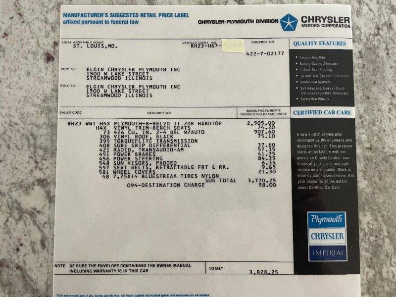 Includes Torqueflite automatic transmission.$907 for the hemi, didn't think they were that much back when.