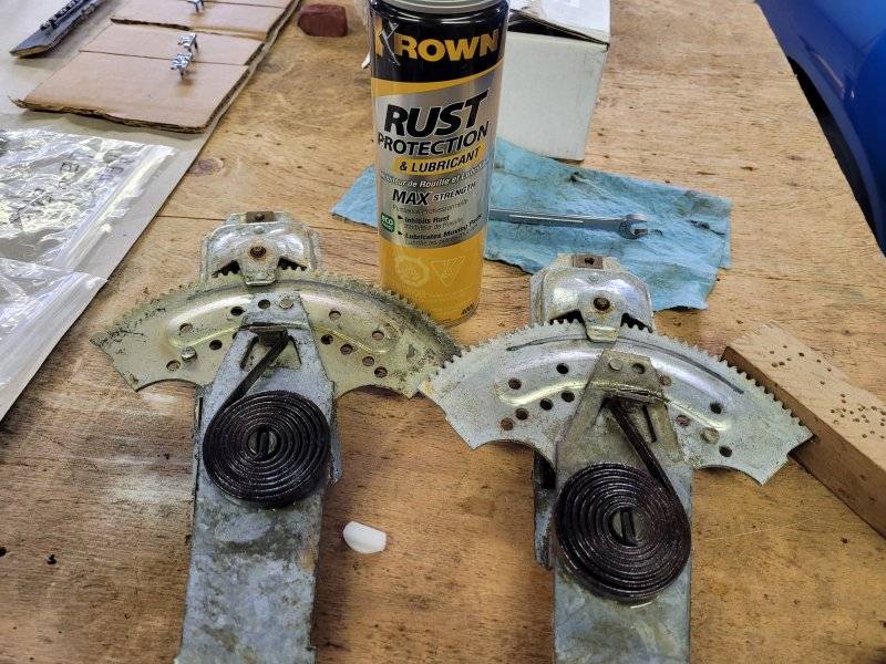 All clean, springs, gear drive and bushings sprayed with Krown. Total, a 30 minute job tops. Just need some fresh grease when they go back into the doors.