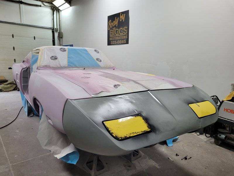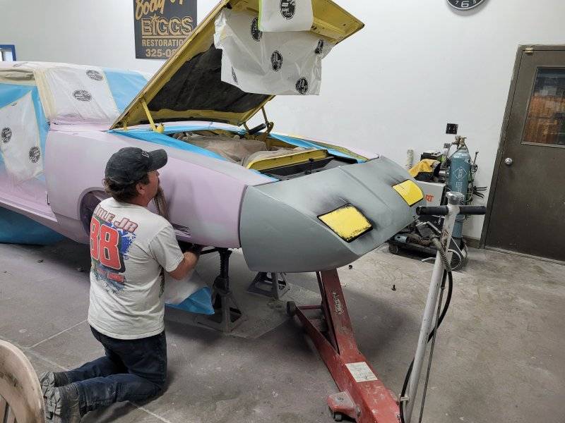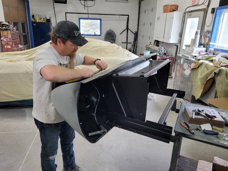 Dan did a beautiful job dollying the nose metal back into place and a skim coat of filler to block it for clean lines.