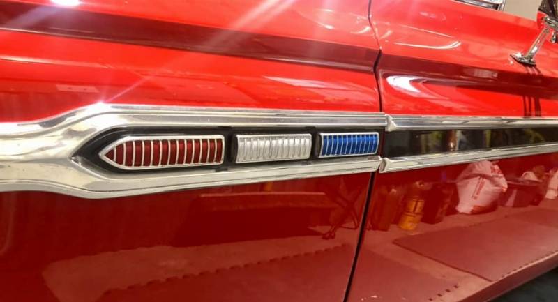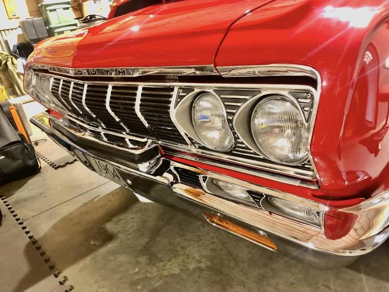 Wow, I finally have ALL THE TRIM on the car except around the Top !! Woo hoo !!! I also got the last of the painting done on the trim. Plymouth on the front, and Red, White,& Blue in the side mouldings …..looks a little better than when I first bought this car !!!!