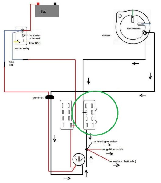 1. Run a 10g wire, with 14g fusible link, from the starter relay, through a grommet in the fire wall, to the "battery" side of the ammeter.