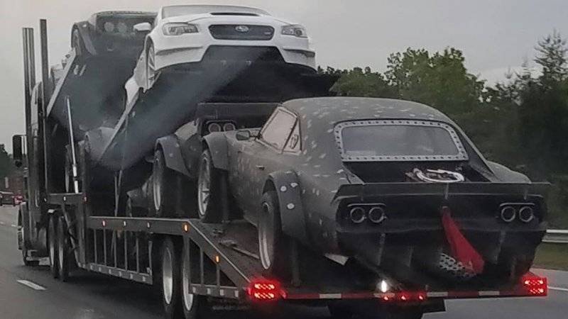 The Bullitt 68 Charger R/T during filming of the movie with the camera rig,equipment and grounding cables mounted on the car.