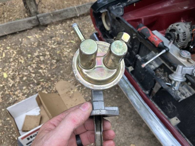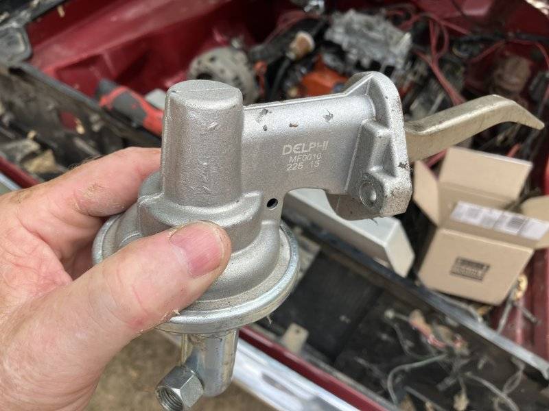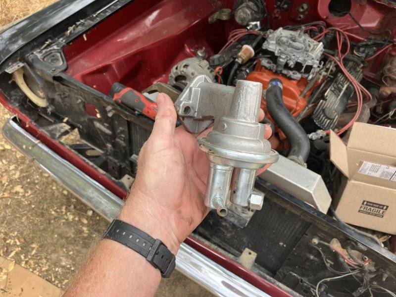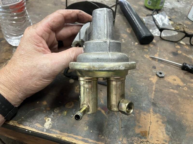 I pulled the carb, changed the needle and seats, power valve and a few gaskets. Back on, it still floods over. I put a ThermoQuad on. It floods over too. Fuel pump? Okay… I swap in another and the flooding continues. The second pump has a twisted fitting that drips so I swap in another pump.