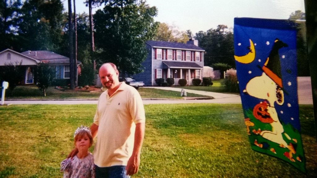 Trying to find some pics of that Impala but so far this is the only one..this is me and my 7 year old daughter in 1999 getting our picture snapped before dropping her off at a neighbors house for a party. My house is the big gray one over my shoulder and you can see the *** end of the Impala parked in my side yard , over my shoulder.