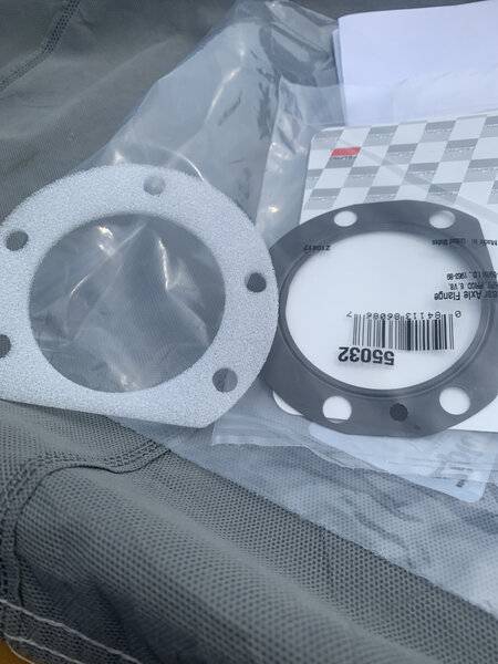 Pick up the video below @ 5:55 into the video.Steel gasket, backing plate, foam gasket, axle.