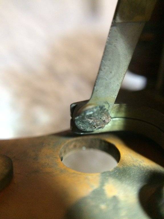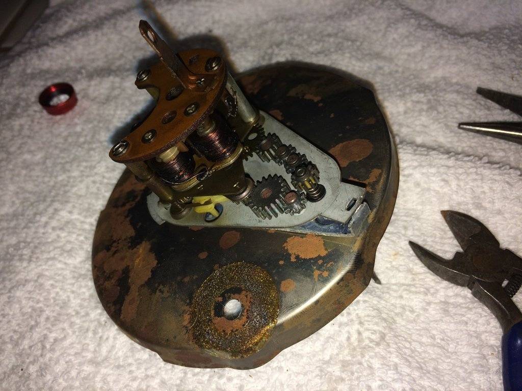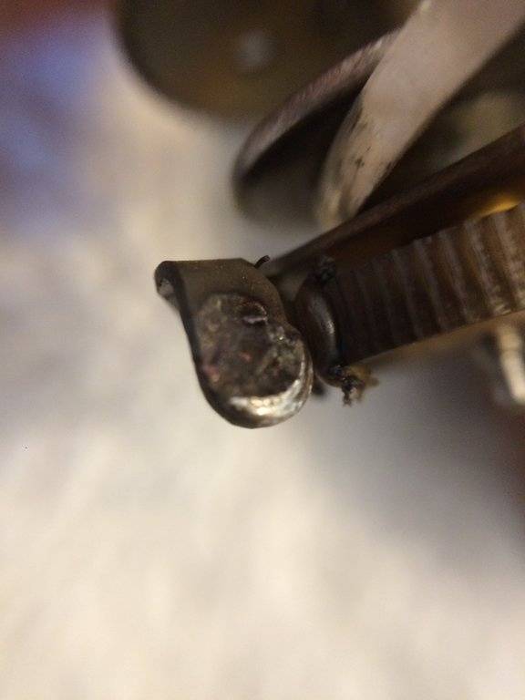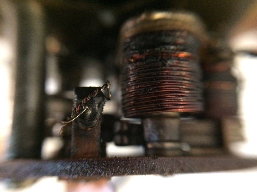 Feeling like i couldn't break it more than it already is, I decided to investigate the clock workings further and learn a little bit. I discovered that I could drive the points away from each other with a small screwdriver and that wouldn't affect wind the mechanism and then I could watch the workings of the clock operate for about 10 to 12 seconds until they came back in contact with each other and then it would stop. At that point I twisted the broken wires of the coil back together put 12 V to it to see if it would work. I had to drive the points apart to get it started and then as soon as they took it down and came in contact with each other there were some tiny sparks as it tried to re-energize itself, then it blew the three amp circuit breaker on my 12 V power supply. As you can see, the points are totally cooked. Way beyond filing. There is hardly anything left of them.