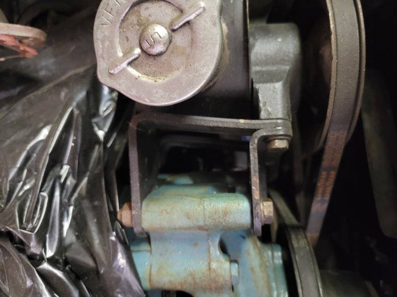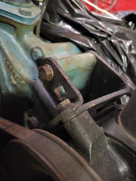 I couldn’t make much out of the parts manual. Unless someone comes up with the answer I may just fabricate a strap to swing off the water pump bolt pivot and catch the bolt on the rear of the pump can and call it good. Everything lines up good and it seems pretty secure with just the front bracket so adding a rear strap should just make it all the more so.