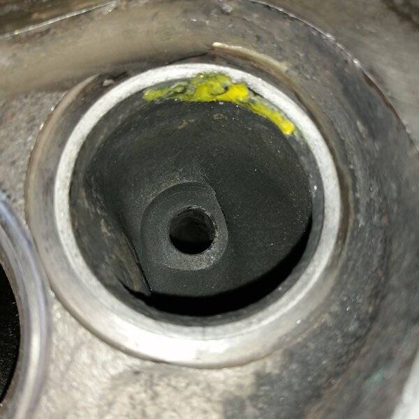 I had the old head out to pull an exhaust stud, so I put a bit of yellow paint in the flaw under the seat. I then lapped in the valve just to see how much seat there actually was.....not much, I'm surprised that it sealed.