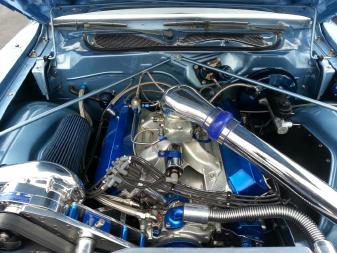 About the time I got it all back together last year, the engine started having oil pressure issues (see the "Dodged a huge bullet" thread for all that) so out it came for freshening. It's basically a 469" low deck stoker with Eagle rods and Ross pistons, using an old Comp custom ground 280/288 hyd. cam. While it was out I had the pistons coated, and replaced the old welded factory stroker crank with a proper 4340 piece. I also added a main cap girdle setup, and converted it over to an external oiling system with a larger pan and billet pump.