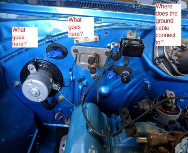 The first two "what goes here" I'm not sure to what you are referring. The second is above the ballast resistor which looks to be in the correct spot.
