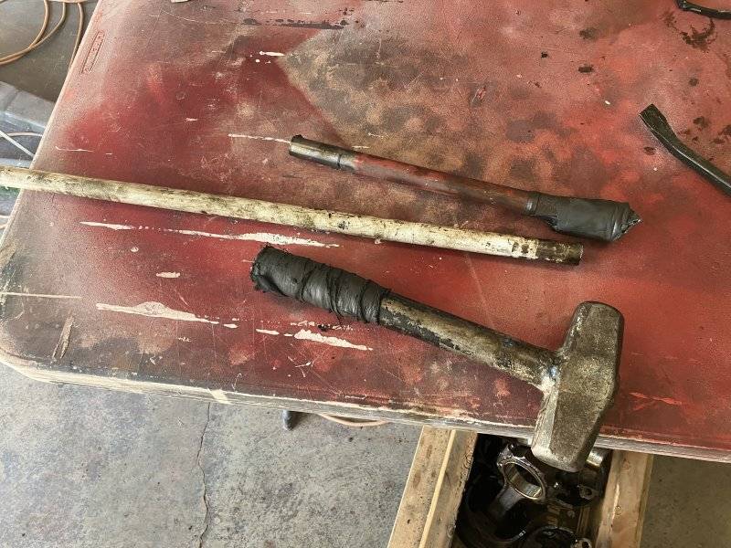 I figured that I needed a bar with some mass and heft and ended up grabbing one of the torsion bars I brought home, an .88 unit. We used it along with a small sledge hammer. This took almost an hour just to get one piston out. We got it though.