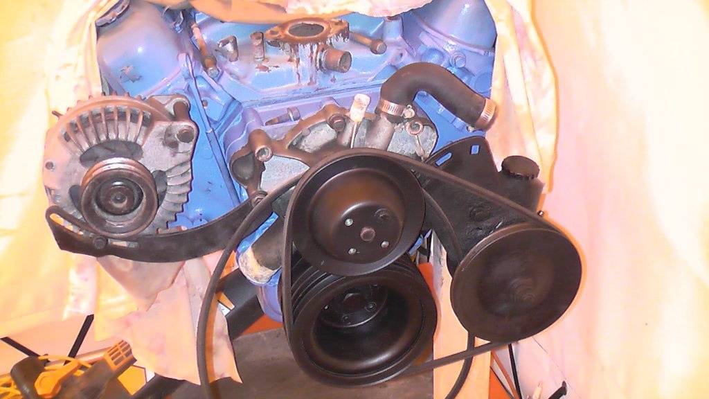 The 318 was an air car,but doing away with it.The power steering pump as you can see lines up,runs off the single water pump pulley and crank witch i figured it would,it was that way when i pulled it a part.But now the alternator needs a pulley,do i need the water pump 2 pulley.At a lost ,just mocking things up .