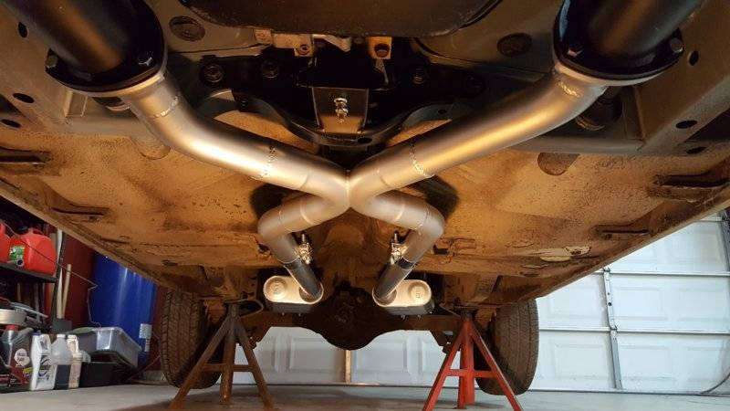 For my personal “Road bound DRIVER” vehicle I used the long case Dynomax Super Turbo muffler with tail pipes @ 2-1/2 inches. Also the power difference between the X & H pipe YOU will not ever feel on the top end.