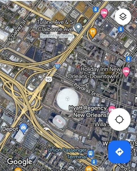 ..and farther away. The round, white roof w/the Mercedes logo is the Superdome!