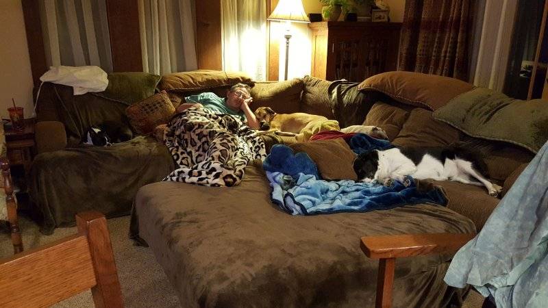 Till I see you again Sadie...the last picture is me at sleep with my herd. Far left was Sally our Boston Terrior, then me, then Penny, our Pug Daisy, then Sadie..all sacked out on our couch. Penny is the only one still with us. Wonderful memories. The last picture is a great way to remind me on a tough day..WHY I LOVE DOGS!