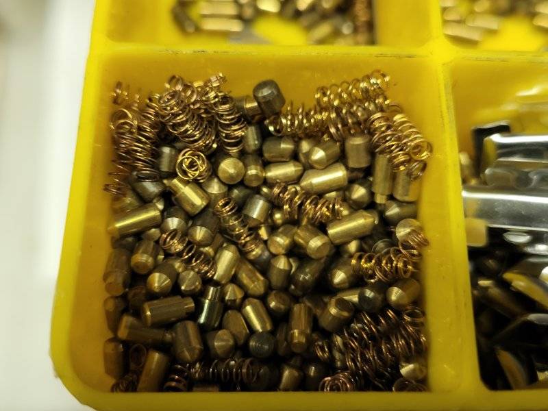 I got some repros and wanted them to work with my ignition key, I said to hell with it while on a Zoom work call (with the cam off) and using a knife and pliers popped them open and rearranged the tumblers, well left one out, and it worked. Not fully proper but super easy and it’s not like it’s a hard car to get into under the best of conditions so I’m fine missing the one tumbler.The only hard part is finding the little pins that match the valleys in your ignition key. Take a door lock cylinder and pop off that little rectangular stainless steel cover. Carefully dump out the springs and pins. I believe there are 5 springs and 10 little pins. Insert your ignition key into the door lock cylinder and then choose one of the 5 holes and insert 2 pins ( 1 blue & 1 pink from the second diagram below) and see if they line up allowing the key to turn. You can see how it all works in the second pic. When the blue and pink pins are lined up with the correct key, the cylinder will turn. The only problem is, it's highly unlikely you'll have all the right pin lengths that match all 5 valleys in your ignition key. This is where one of those rekey pin kits would come in handy or a bunch of donor lock cylinders. I have a couple door lock cylinders where i only used 3 out of the 5 pin slots because i dind't have enough matching pins.