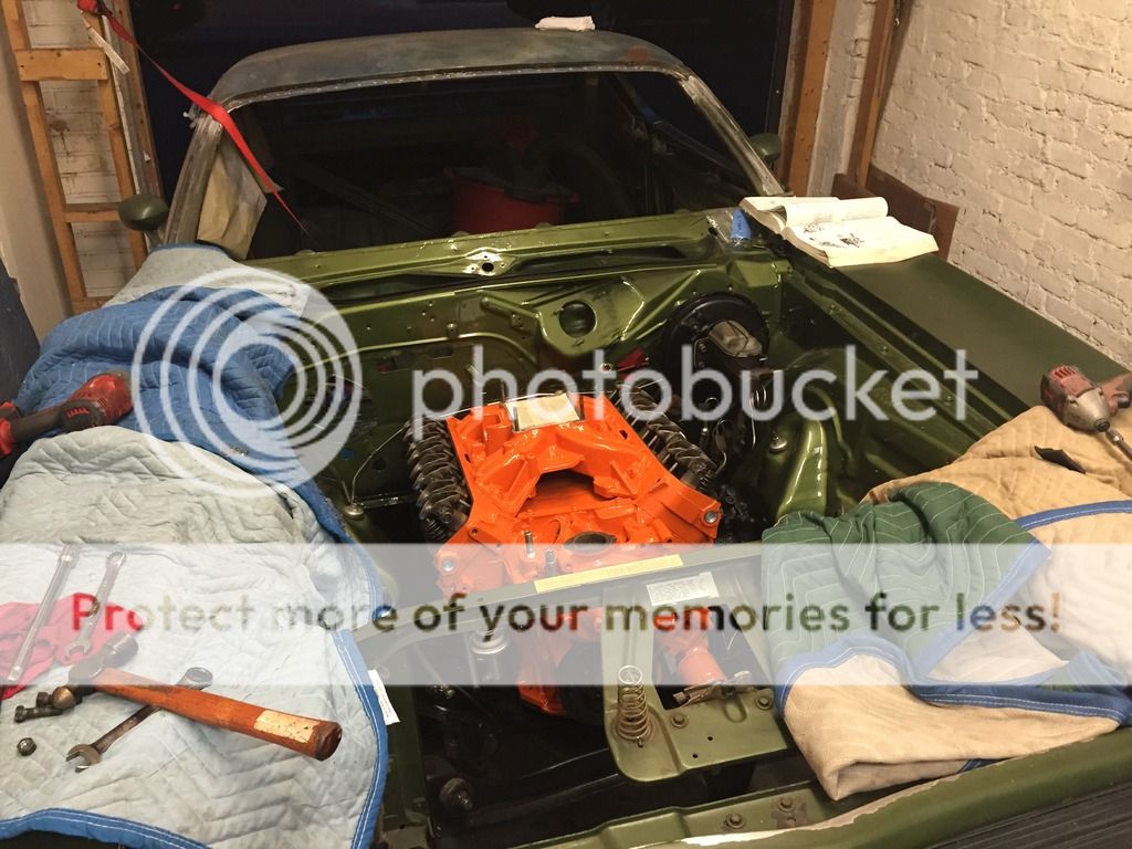 So last night, me and a friend attempted to put my fresh 440 into my 71 charger. I started off trying to do it with my 4 speed trans already in the car. That ended up being a bad idea, so we pulled out and I yanked the tranny and bolted it up to the bellhousing.