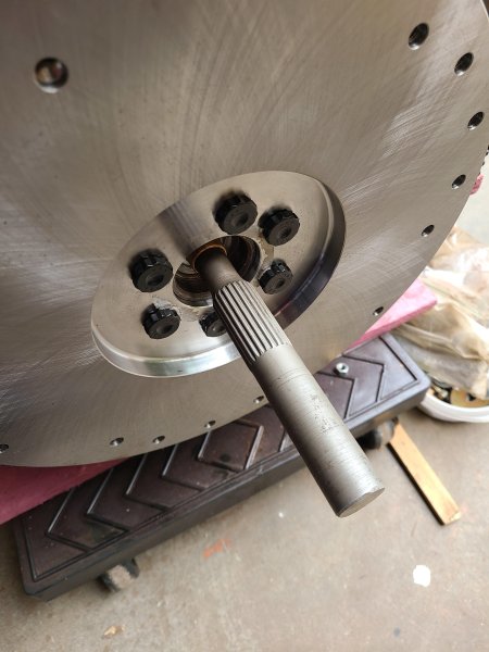 I made fixture and using the flywheel for a guide I drilled out this 383 forged crank for the 833 input shaft in situ since the engine didn't need anything else.