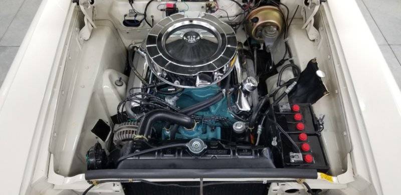 Ha! Not! I will have to snap a closer photo of mine.....Incorrect battery, wrong distributor, cap & advance unit, fan shroud missing, incorrect radiator cap, incorrect plug wires, plug wire loom on wrong side of T-stat, missing the 2nd loom which bolts to driver's side valley pan bolt. Oil fill cap & PVC breather are switched out, horn relay orientation incorrect on firewall, power steering pressure hose incorrect orientation, clutch rod access oval plug missing, some kind of harness routed through open hole, air cleaner wing nut incorrect. I wish there were other photo's from a side view. Lot's wrong for a hammer price of $52,800...annnnd, it's a hardtop.