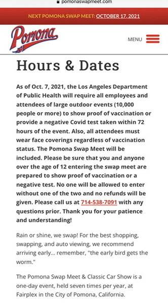 As of Oct. 7, 2021, the Los Angeles Department of Public Health will require all employees and attendees of large outdoor events (10,000 people or more) to show proof of vaccination or provide a negative Covid test taken within 72 hours of the event. Also, all attendees must wear face coverings regardless of vaccination status. The Pomona Swap Meet will be included. Please be sure that you and anyone over the age of 12 entering the swap meet are prepared to show proof of vaccination or a negative test. No one will be allowed to enter without one of the two and no refunds will be given. Please call us at 714-538-7091 with any questions prior. Thank you for your patience and understanding!
