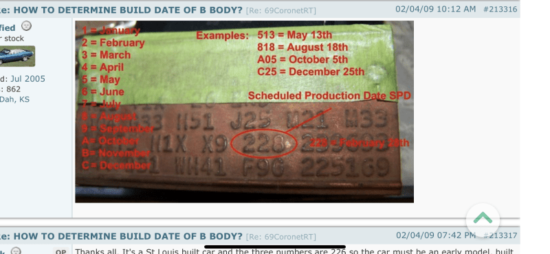 Hello from southern Illinois, Was at the Moparty today at bowling Green KY. good show. I was talking to a gentleman today about his GTX we was talking about fender tags I quest I been wrong for years but I thought the build date say A16 is October would be a early build car and a 912 would be a late build car? He said he thought a 912 would be a early build car ?unless I just wasn’t following him so on a 1969 car would have been built in 68 A Oct/B Nov/C Dec/ then 1-9 is the month’s car build in 69? nine being the latest a car was built in that year? He tried telling me but I just didn’t follow him. He was a nice guy with a nice GTX. Thanks Kb9gib