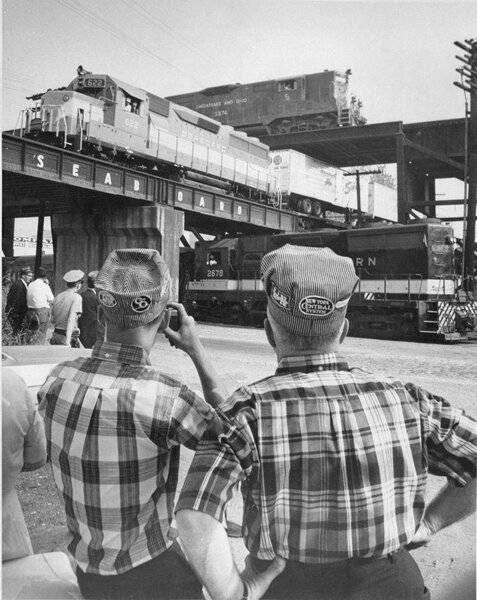 In late summer 1951, the Chesapeake and Ohio Railway ran its first diesel-powered locomotives through Richmond on two of its passenger trains. Here, train engineer Mr. Denton got orders from stationmaster Mr. Boykin. By the end of the year, the company hoped to have most of the steam locomotives in its line replaced with diesel-electric ones.