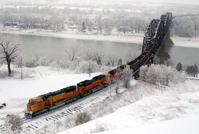 Coal loads leaving Mandan North Dakota headed East crossing the Missouri River into Bismarck North Dakota headed for Dilworth Minnesota 2006ish. I was operating trains on this day and remember a photographer crouched on the hill around this time. So it's possible I'm running this train . Yes I am a Locomotive Engineer.