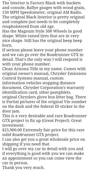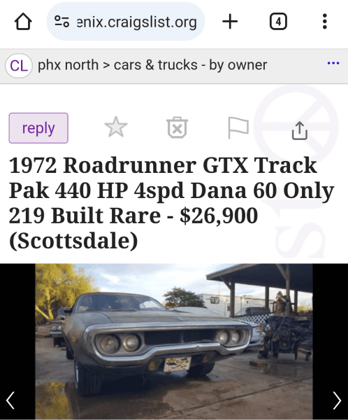 1972 Plymouth Roadrunner GTX for sale by owner - Cave Creek, AZ - craigslist