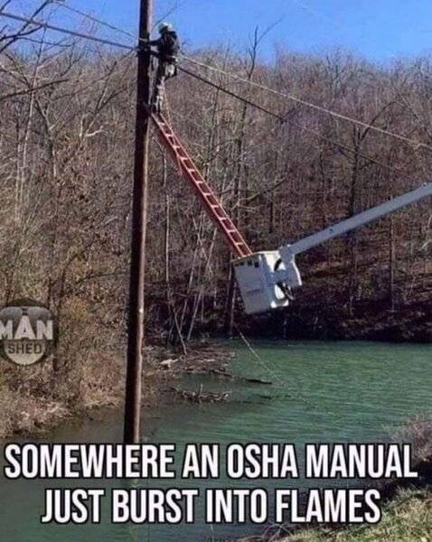 I have a neighbor that is the OSHA compliance officer for a major power company, when he first moved into the neighborhood the tree in front of the house he'd bought needed trimming... He started from the ground working with a pole saw... Then he climbed up an A frame ladder with his pole saw... Then he was using his pole saw on the ladder with the ladder in the bed of his truck.. And finally he went to an extension ladder braced against the high branches in the bed of his truck.... I wish I had taken pictures....
