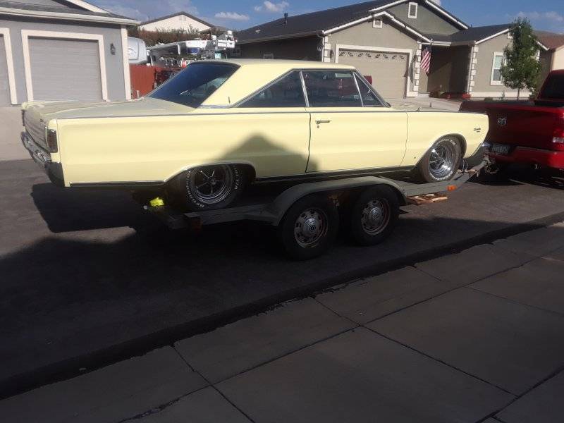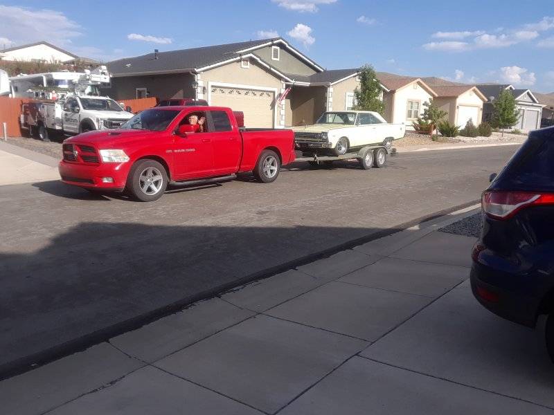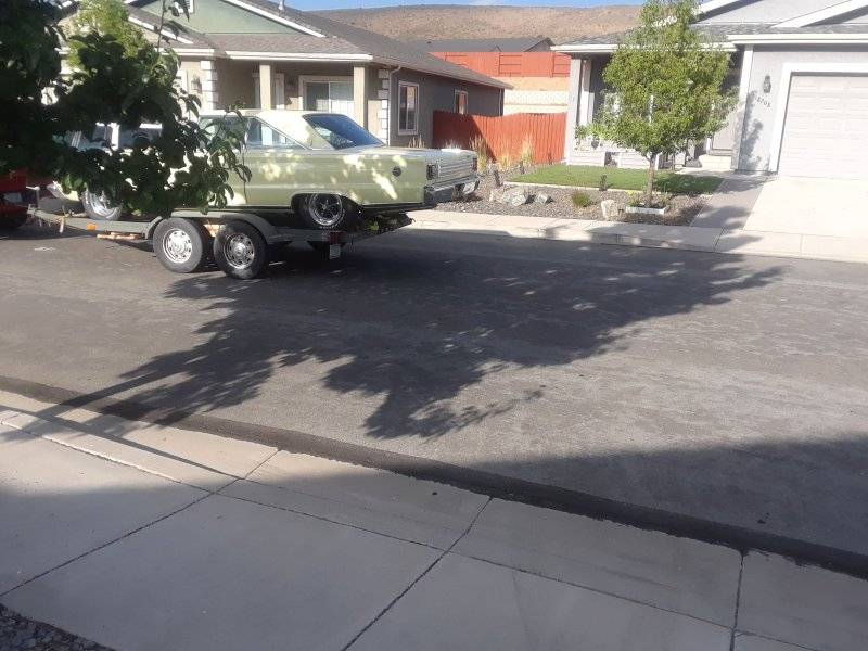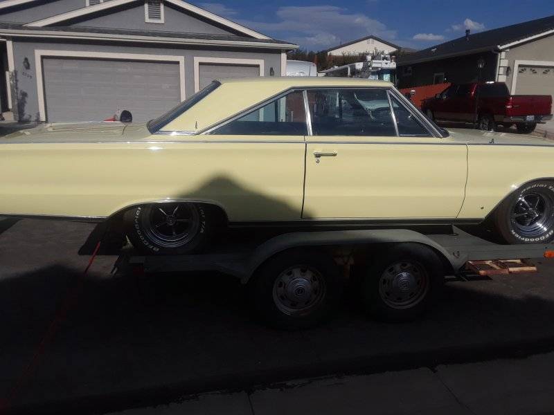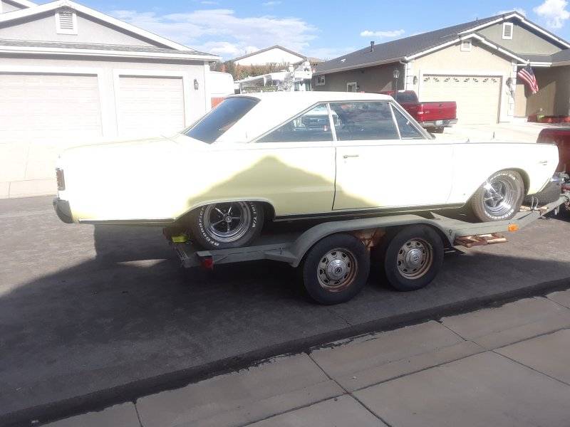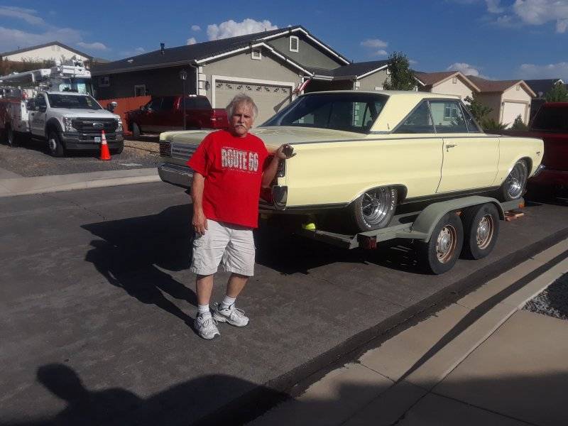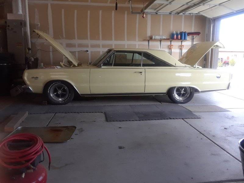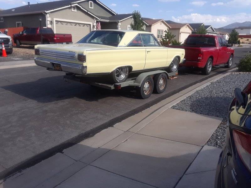 Well, she is actually gone from the garage. I have owned this car since 2004, re-built it entirely as it came as a roller first. Stripped it, salvaged original parts, sourced NOS and correct re-pop parts, spent countless hours block sanding it and sanding it some more. Re-did the entire interior my self, replaced the windshield with correct new, and still it wasn't finished. So after firing it up yesterday as the new owner came to pick it up to take it to its new home in Tuscon, AZ, I watched and assisted to get it on the trailer, tied down and driven off to its new home. Bittersweet??? Yes it is. However this is not the first time I have let go of a classic car either. I really haven't driven it all that much and it just sat protected in the garage gathering up dust from the Great Basin Desert of where it was kept. The new owner, which I will acknowledge in a bit, and his crew of 2 that made the trip are some steller car guys and MOPAR guys. I always have enjoyed making acquaintances with those also in the hobby and wasn't disappointed in the least. Just great car guys. Hell they even raved and gave an approval of it as we got it ready to load. They were like busy bees going over just about everything from top to bottom. There are some imperfections and such that were noted but never was there any attempt to re-negotiate the original agreed deal. Now that is say a lot about my work and their expectations from an on line sale of a collector car. "Daffy" as I named her because she always schocked me when ever I got close and because of the paint color...Daffodil Yellow...is going to have some very nice stable mates as she is bedded down with her new owner. He has some additional plans for it, and I will let him talk on that as he is also a member here on FBBO. As to my continuing on here on this great site, is still up in the air, as I am not planning on getting another project or completed one for the foreseeable future. Aging faster than I would like so no wrench turning and crawling around on concrete for this ol' guy. So a few pics from the final time here at the hacienda on Grizzly Bear Ct, here in Reno NV...Enjoy it GTX6970/Bill!!! Cr8crshr/Bill
