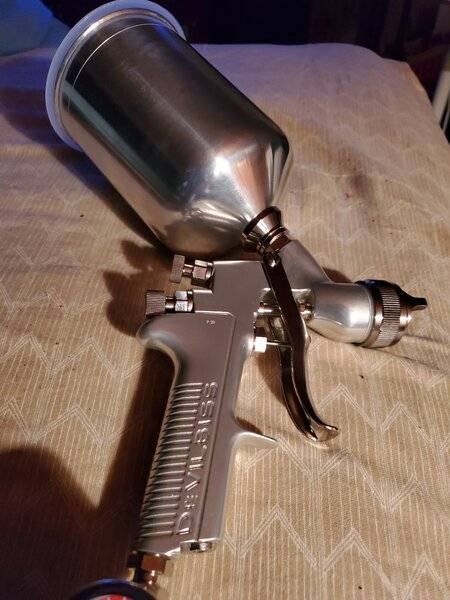 I used a 15 dollar harbor freight gun for the engine compartment and trunk. Then I stepped up to the big money Eastwood concourse gun for 130 bucks for the rest. Lmao