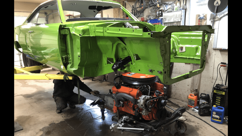 That's the BEST way to do it on a Mopar - from the bottom!Transplant almost complete, YES!