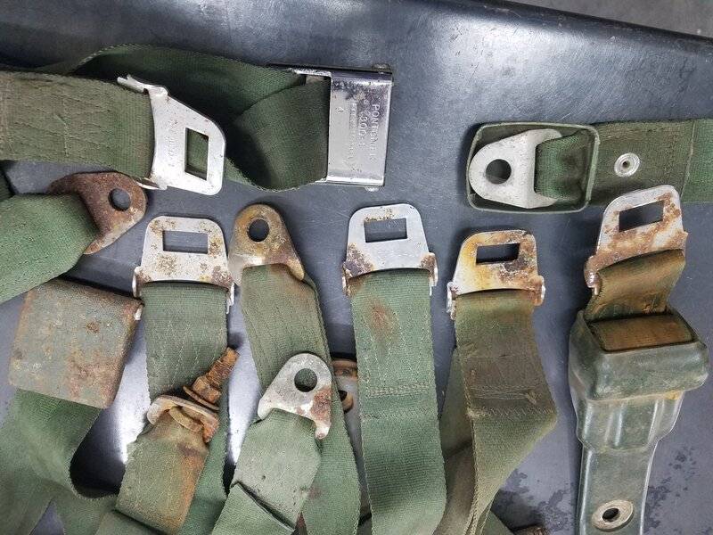 Very rough as far as rust goes green belts from a 1969 Charger. One front lap belt is actually in fairly decent condition and both front retractable mechanisms work good. $36. shipped in an USPS medium flat rate box if using friends and family, or 37.44 if using goods and services. Or $20. if picked up.
