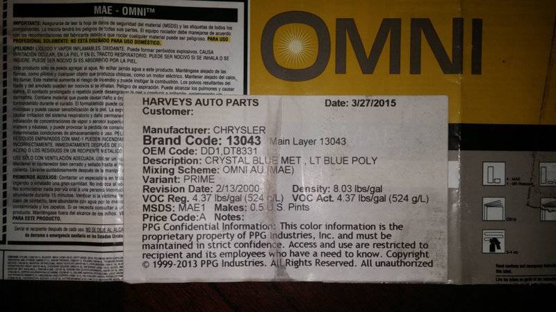 Thanks Fred, I was going to paint my '65 Coronet B5 blue but I really like the color of your Satty and I might have found a different choice.Thanks Bob. If I can trust the fender tag decoders on the web the factory color code is 28D .The tag has PAINT "WD1 D", a 2-tone car with white top. A previous owner painted it all with what I believe is the factory color. See the label below.